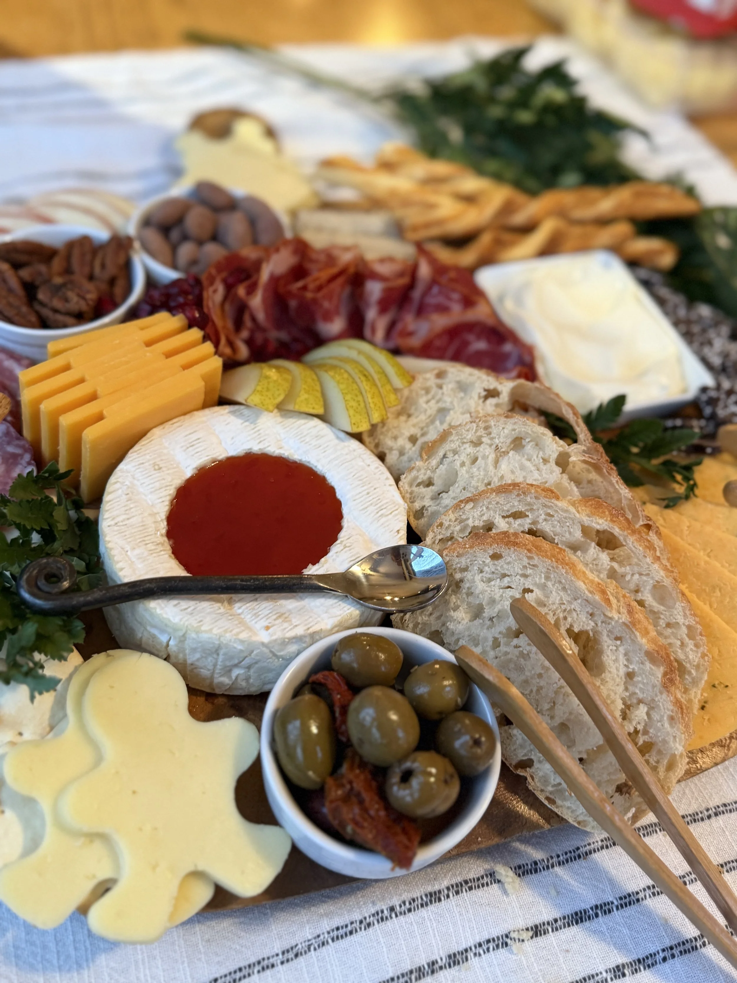 Designed for casual winter entertaining, this board brings together creamy cheeses, cured meats, fresh bread, sweet bites, and savory snacks, perfect for long afternoons and candlelit evenings.